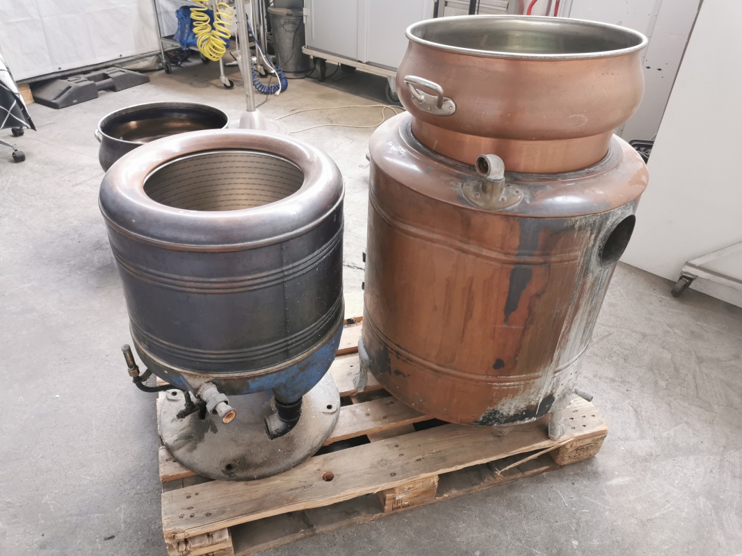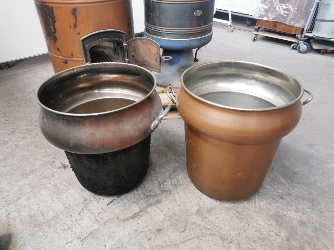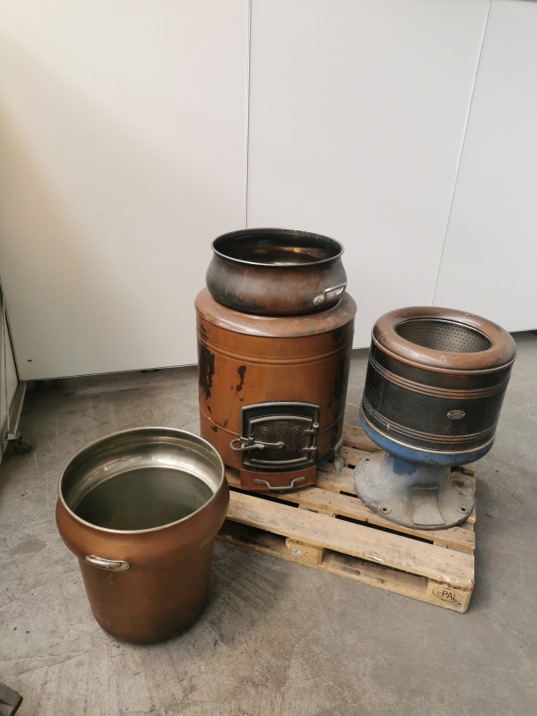 Diese historischen Kupfer-Waschmaschinen von V-Zug und Tambour stammen vermutlich aus der Zeit zwischen 1930 und 1950 und wurden früher mit Holzfeuer betrieben – zum Waschen, Seifenkochen oder Wassererwärmen.