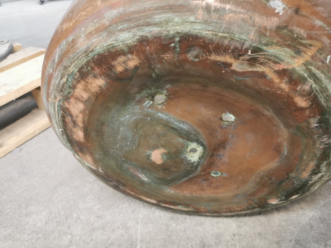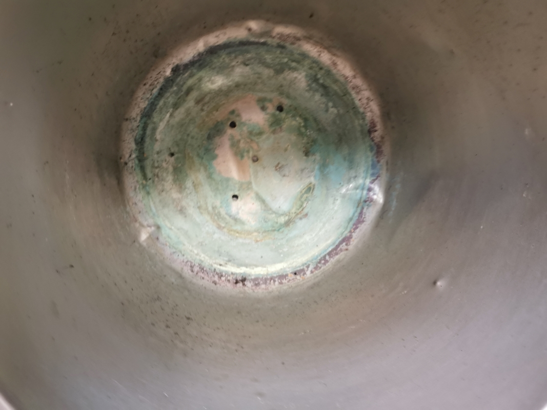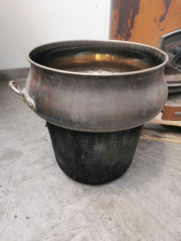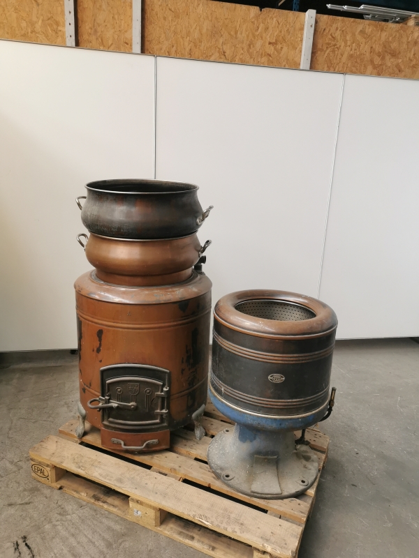 - 2 Kupferkessel, einer davon mit kleinen Löchern unten – vermutlich später als Blumenkessel verwendet