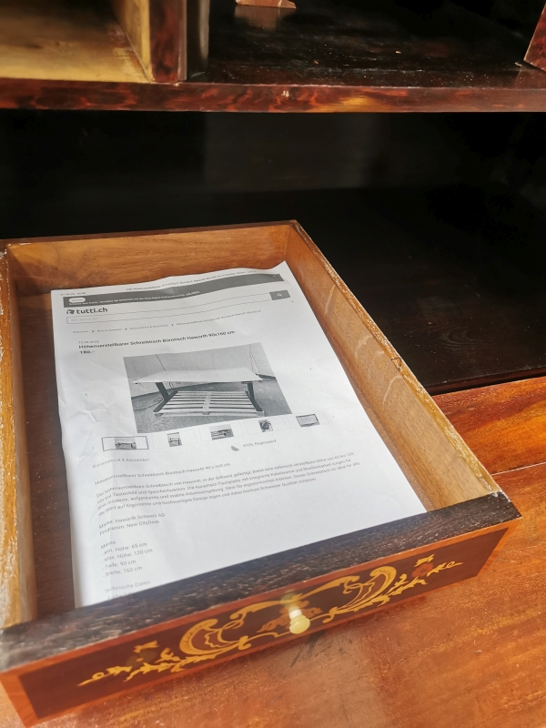- Aufbau: Mehrere Schubladen im unteren Teil, Aufklappplatte mit integriertem Innenfach (kleine Schubladen und Ablagen)