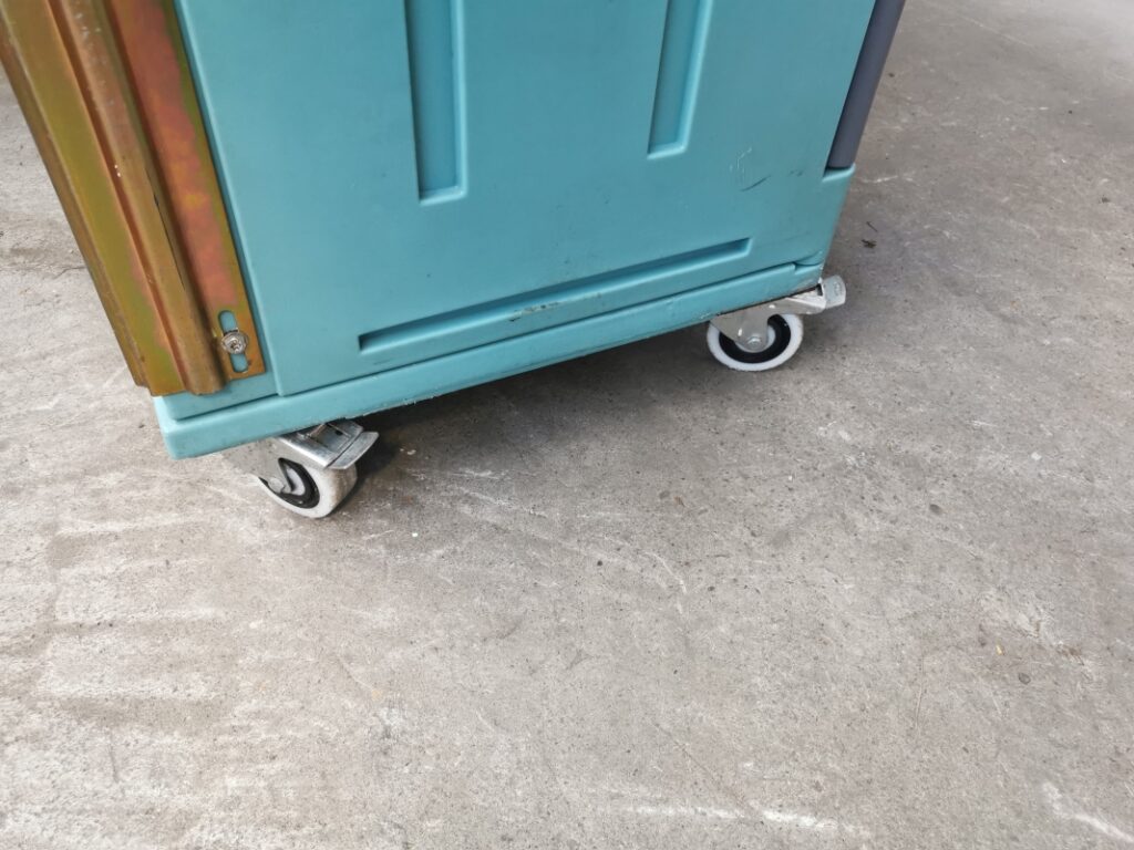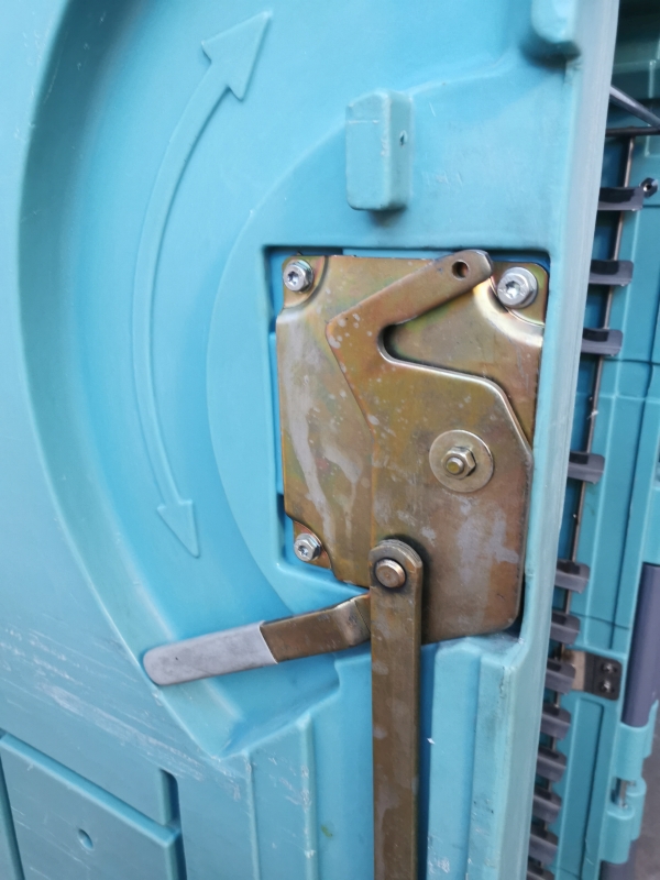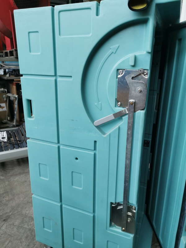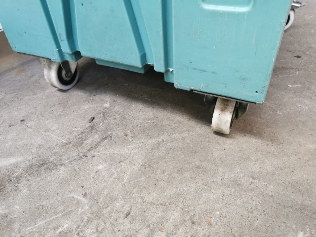 Zwei Lenk- und zwei Bockrollen (100 mm) lässt er sich problemlos über verschiedene Oberflächen bewegen. Der Behälter verfügt über ein Schnellverschlusssystem , eine um 270° zu öffnende Tür und zwei ergonomische Griffe , wodurch er äußerst benutzerfreundlich und effizient für wiederholten Zugriff und Transport ist.