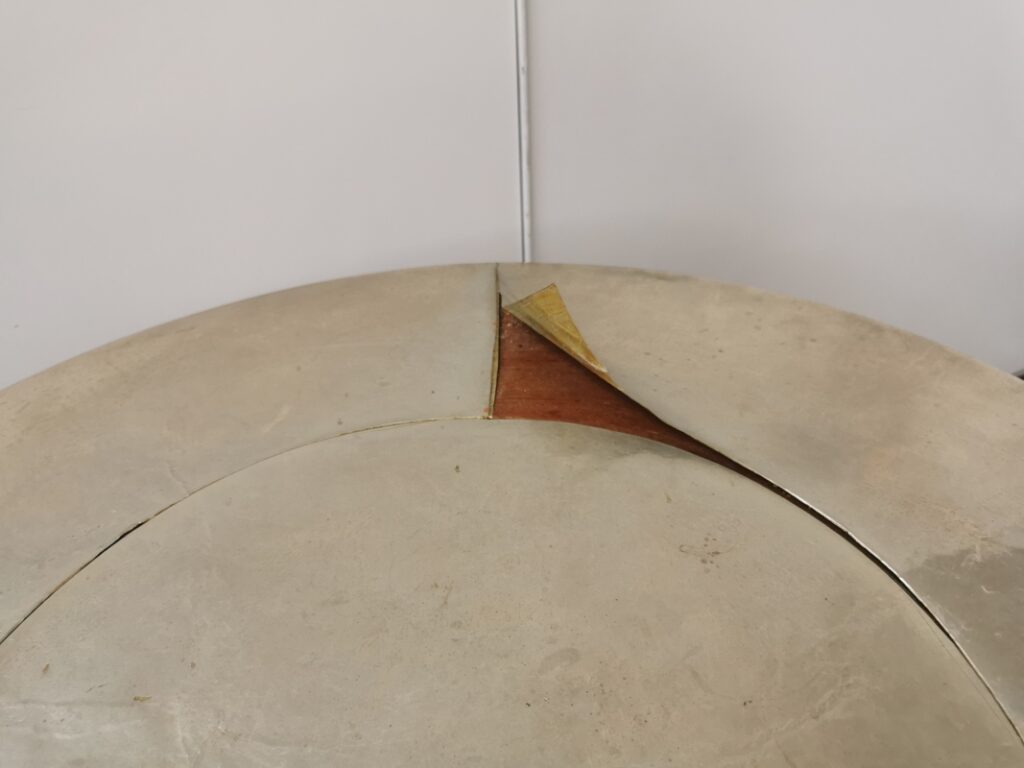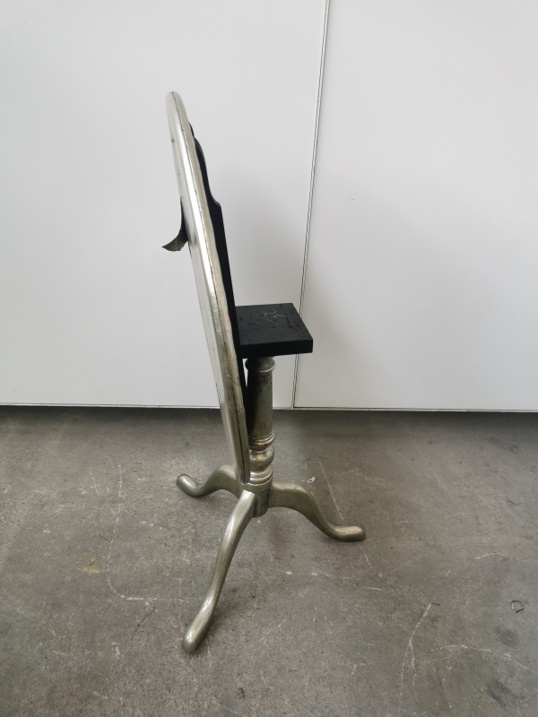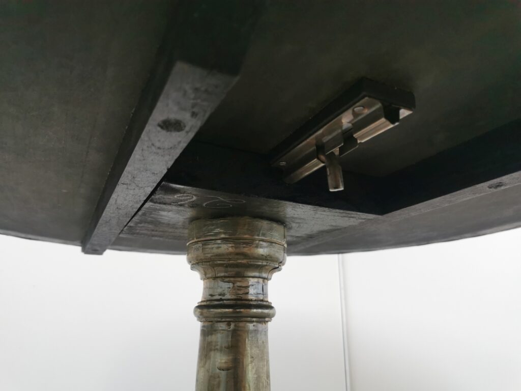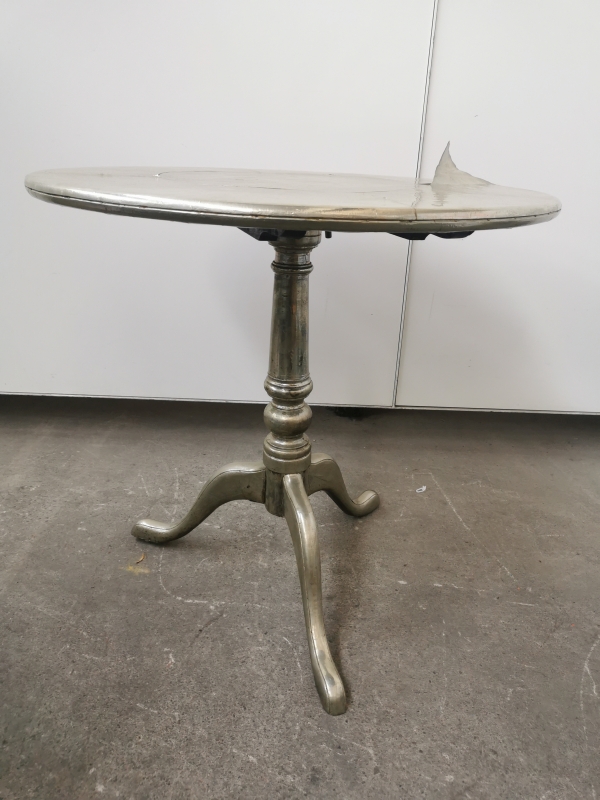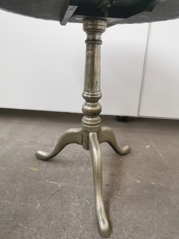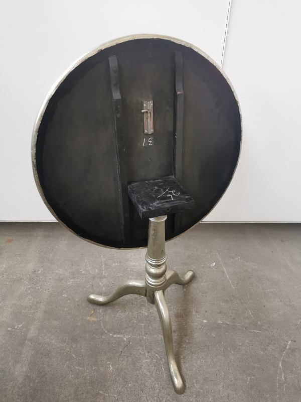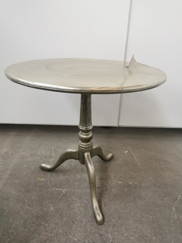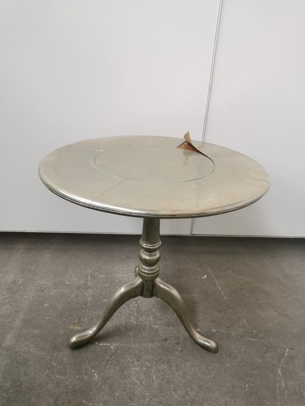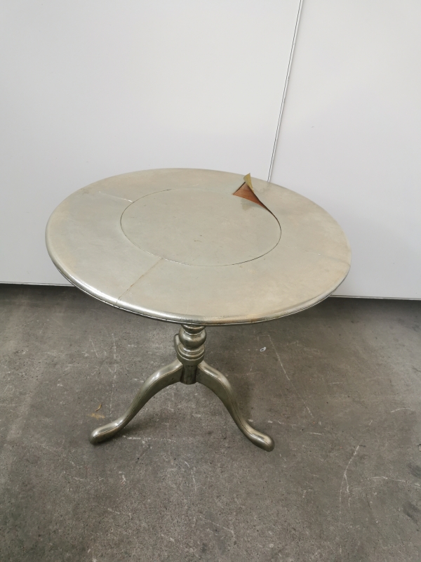 Wunderschöner runder Klapptisch mit originalem Scharniermechanismus (siehe Fotos). Die Tischplatte ist mit einer besonderen Metallfolie versehen, die dem Möbelstück einen einzigartigen Vintage-Charakter verleiht. Die Folie hat sich jedoch stellenweise gelöst – der Tisch ist daher restaurierungsbedürftig, bringt aber grosses Potenzial für Liebhaber antiker Möbel.