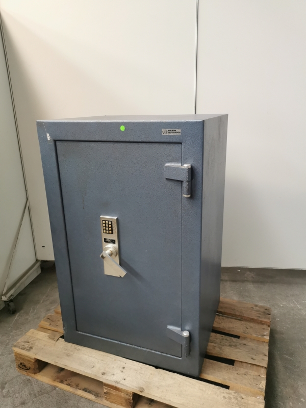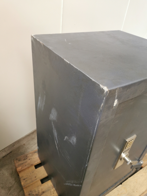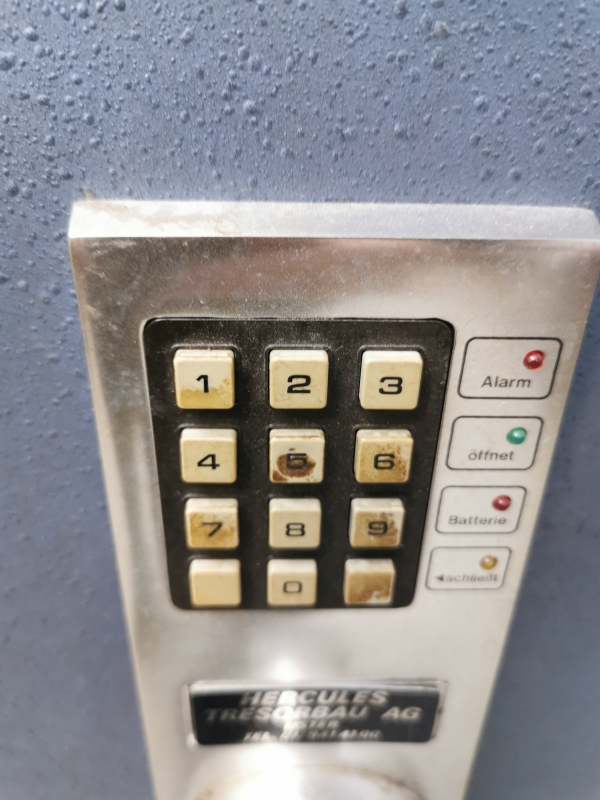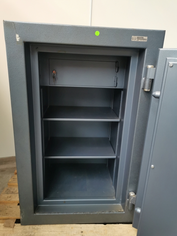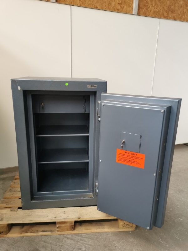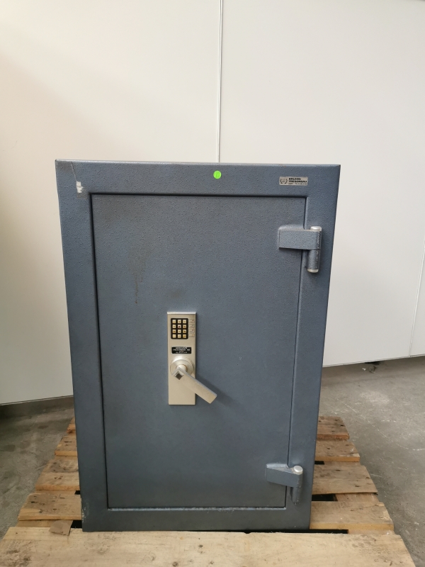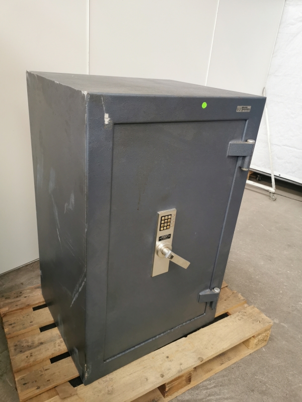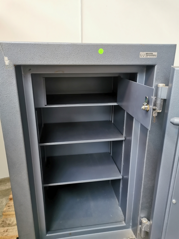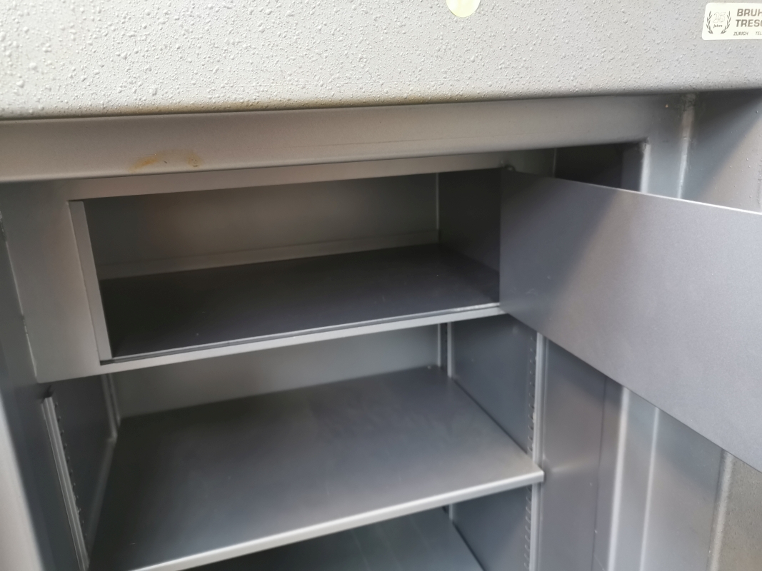 Stabiler, massiver Tresor der Marke Bruin Tresorbau Zürich (hochwertige Schweizer Qualität, Hersteller existiert heute nicht mehr). Der Tresor eignet sich ideal für die sichere Aufbewahrung von Wertgegenständen, Dokumenten oder Bargeld. Aufgrund des massiven Gewichts ist ein Transportmittel (Palettenrolli, Stapler oder professioneller Tresortransport) erforderlich. Bei uns kann der Tresor mit einem Gabelstapler aufgeladen werden.